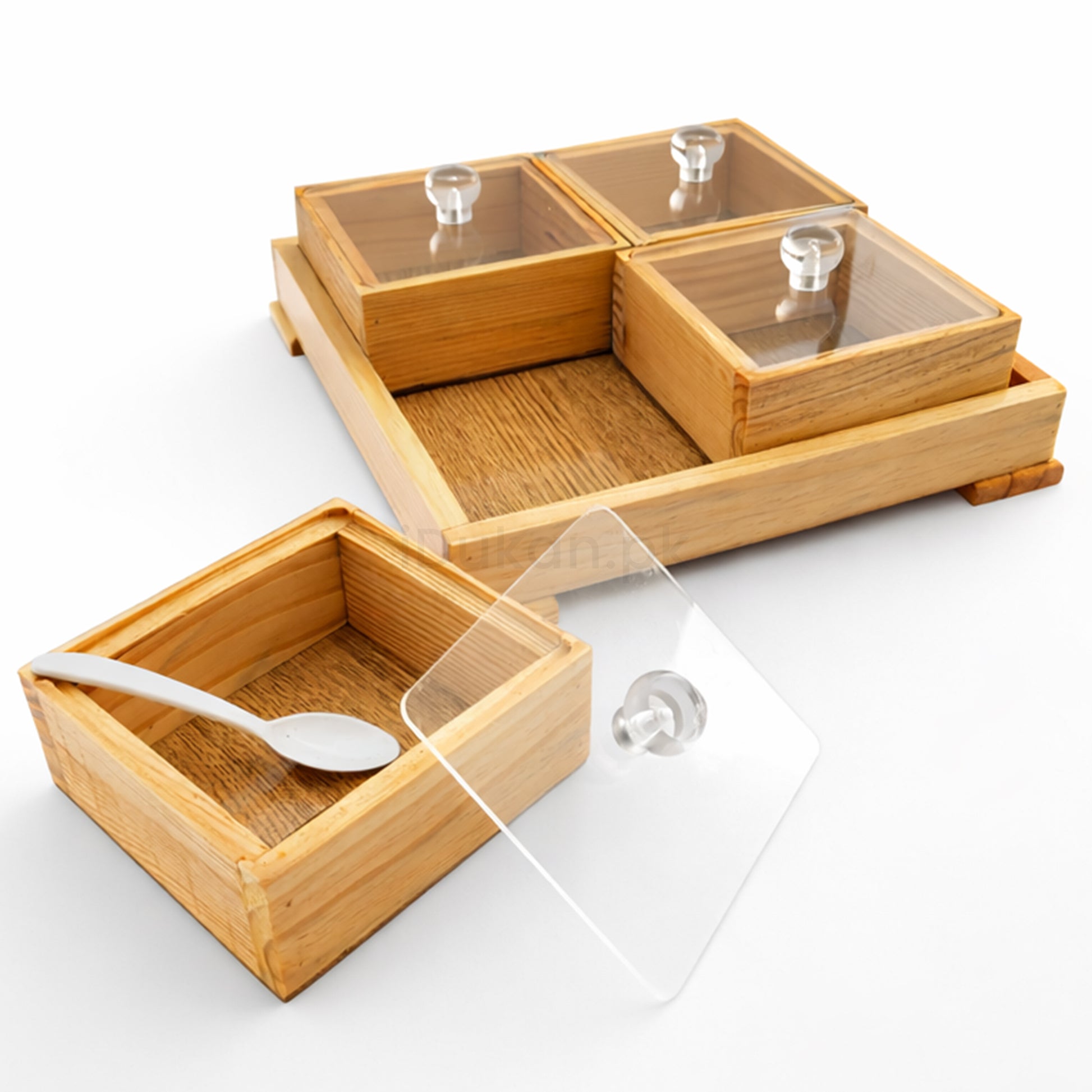 Each box comes with a clear acrylic lid, allowing you to quickly see what’s inside while keeping contents fresh and protected. The matching wooden tray keeps all boxes organized in one place, making it ideal for your kitchen counter, dining table, or tea-time setup. A wooden spoon is included for convenient and hygienic serving.