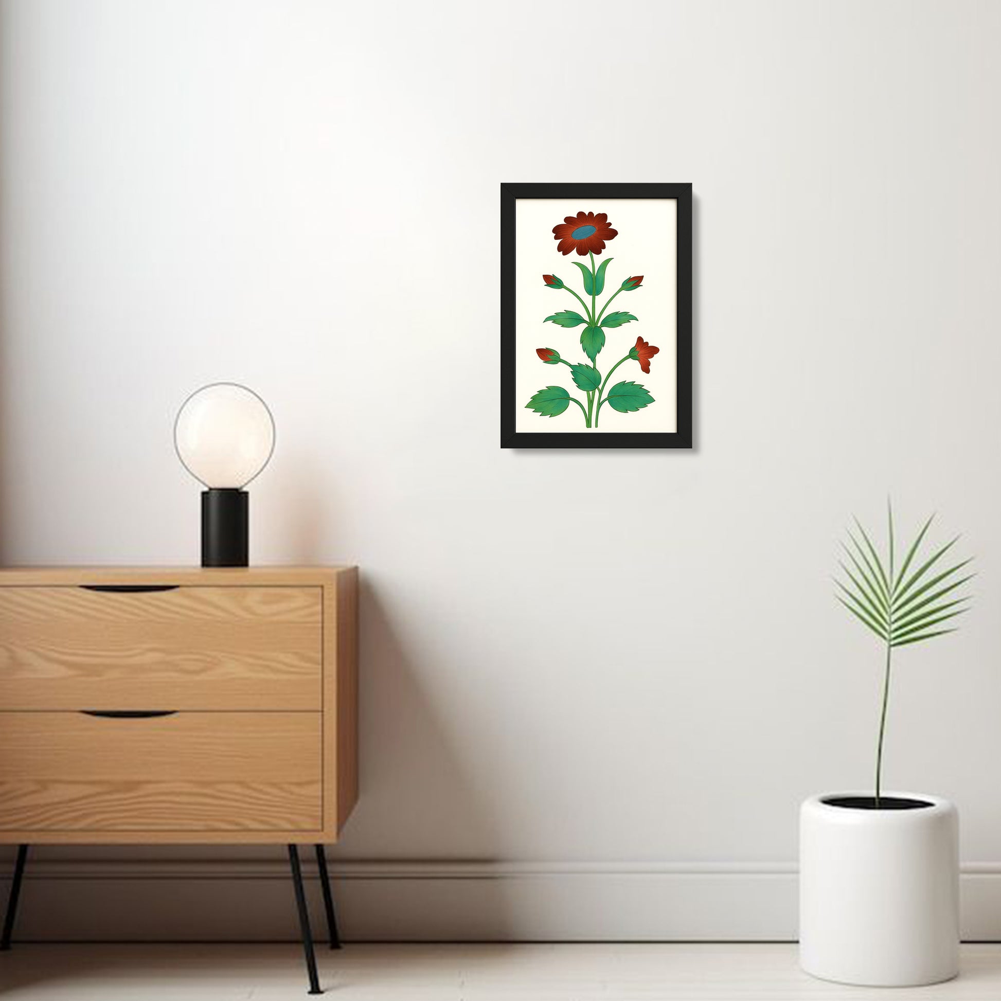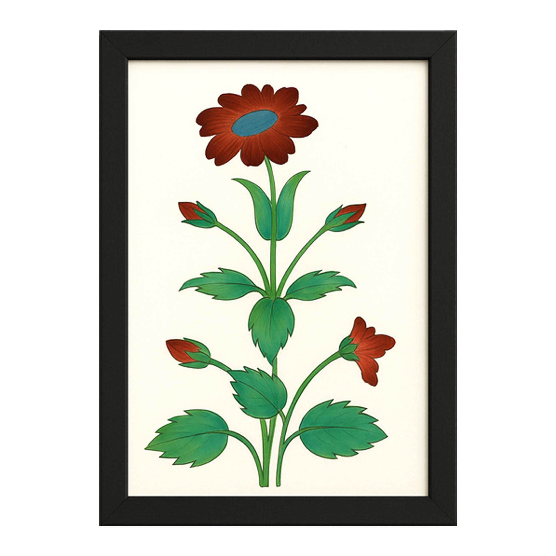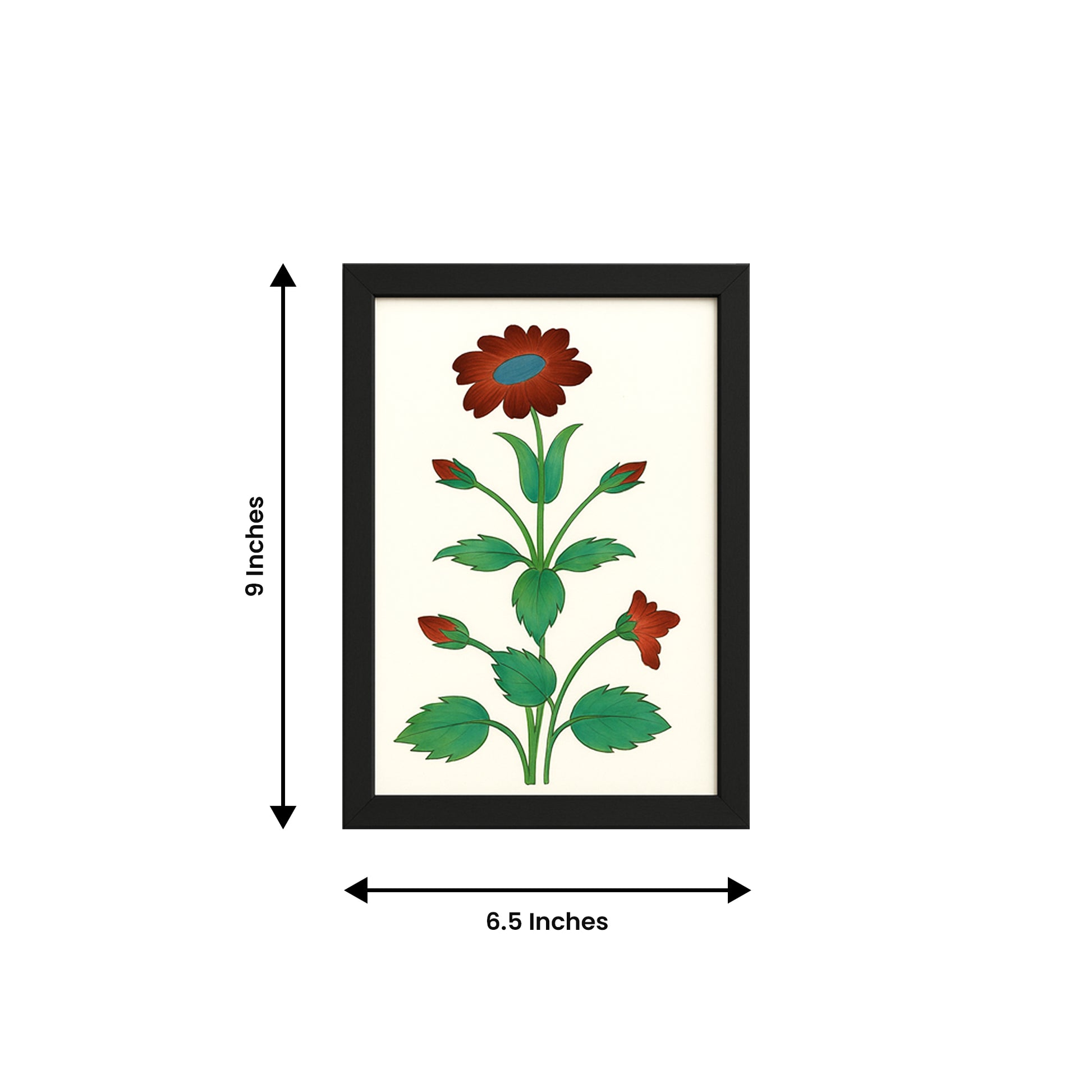 Each flower is carefully hand-painted using a fine brush called 'kalam' and opaque watercolors on wasli (handmade paper). The plain backgrounds in the composition of these paintings have been thoughtfully chosen and paired to showcase the beauty of the flora as well as the highly stylized visual language of miniature art.